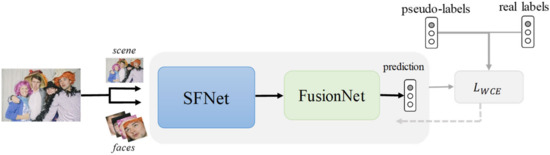 Equation (18) shows the WCE-Loss function when the scene features are evaluated, where denotes the hard label of group emotion in the i-th image. denotes the parameters of the k-th classifier for the scene feature, and C is the number of categories of group emotion. As shown in Equations (18) and (19), we used to compensate for the contribution of every training sample. If we use labeled data for training, is set to 1. If we use data with pseudo-label for training, the value of is set to equal the cosine similarity between the annotated soft pseudo-label, , and the probabilistic output of prediction net, .