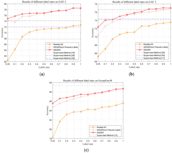 Figure 5a indicates that our SSGER framework achieved the best accuracy at distinct label rates on the GAF2 dataset. Even when the label rate was 0.05, our method still achieved better accuracy than the supervised method. Figure 5b shows that our semi-supervised framework obtained better overall accuracy than the ResNet50 and the framework without pseudo-labeling for all label rates. When the label rate was greater than 0.7, our SSGER framework obtained a better classification accuracy than the state-of-art supervised methods. The curves depicted in Figure 5b show that our framework also performed well with fewer labeled data on the GAF3 dataset. In Figure 5c, compared with the ResNet50 and the framework without pseudo-labeling, our framework also obtained a superior performance for each label rate on the three datasets.