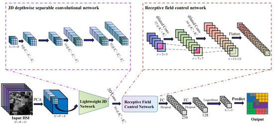 For the purpose of solving the above problems, the 3D lightweight receptive control network (LRCNet) is proposed in this paper. We combine 2D and 3D convolution to effectively integrate the features from the spatial and spectral dimensions. Next, in order to lower the computational cost and reduce the number of parameters, we employ depthwise separable convolution and convert it from 2D to 3D format. In order to reduce the negative impact of a low spatial resolution, we control the size of the receptive field based on dilated convolutions. Below is a summary of this work’s contributions: