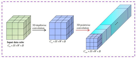 Considering the limitations of 2D depthwise separable convolution, we propose the 3D depthwise separable convolution technique, which can fully extract the spatial–spectral features and learn joint features from multiple bands to enhance the classification performance. As each 3D convolution convolves a data block, it is possible to capture the features of adjacent groups of bands. Figure 2 depicts the structure of the proposed 3D depthwise separable convolution (3D-DW) module. The proposed technique also splits the standard 3D convolution into halves, including 3D depthwise convolution and 3D pointwise convolution.