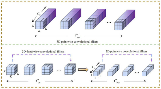 Since and , is obtained using Equation (11). Therefore, it is evident that 3D depthwise separable convolution greatly reduces the computational cost.