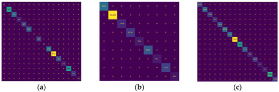 The confusion matrix obtained using the proposed method by using the IndianP, PaviaU, and SalinasV datasets in the first, second, and third matrices, respectively.