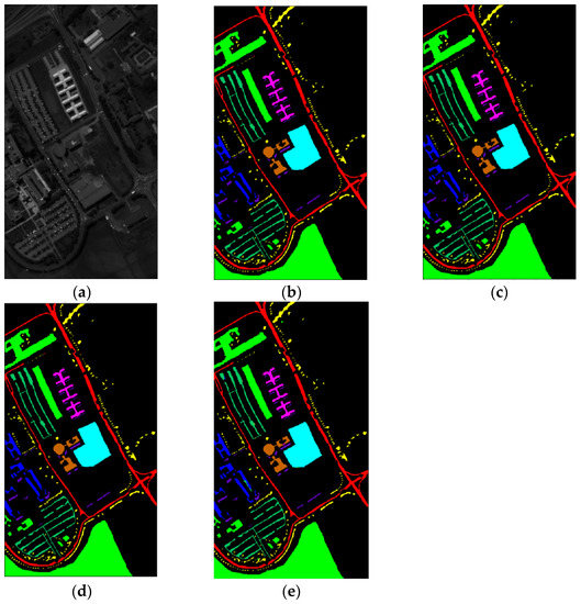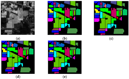 The classification map for the PaviaU dataset: (a) original image, (b) ground truth, and (c–e) classification maps obtained using LRCNet, HybridSN, and DSSNet, respectively.
