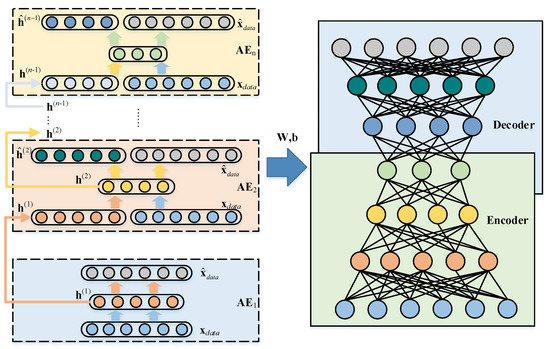 SAE is a deep learning model stacked by auto-encoders. It deletes the decoding part after training the AE and inputs the hidden layer parameter obtained by the first AE into the second AE for training to obtain a new feature representation. After repeating the above steps several times, the desired SAE model can be obtained. The model structure is shown in Figure 1. After the network pre-training process, the corresponding hidden layers of each AE are stacked to form a deep auto-encoder network with multiple hidden layers. Similar to traditional AE, the parameters of the network are fine-tuned using the backpropagation method by calculating the error between the network output layer and the input layer. As a typical deep learning network, SAE has better feature extraction ability than AE, and its pre-training steps can avoid problems such as over-fitting of network training.