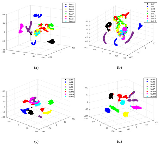 According to different fault types such as step, slow change, viscosity and unknown faults, Fault1, 2, 5, 6, 7, 13, 14, 19 are selected for the experiment. The visualization result of extracting features by t–SNE is shown in Figure 8 and Figure 9. According to Figure 8, original data is mixed up between the variables without feature extraction. In addition, visualization result of extracting features by PCA, GLPP, SAE and the proposed method are shown in Figure 9a–d. As shown in Figure 9, the visualization result of extracting features by compared method provided better performance of separation than result of original data. However, fault types cannot be shown in the features for the reason that PCA, GLPP and SAE are unsupervised learning algorithm. Consequently, the visualization results are still mixed. However, features of fault type were extracted by adding supervised part into the DESAE algorithm, which provides better performance of monitoring.