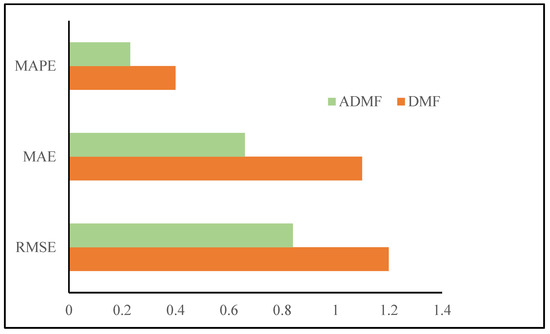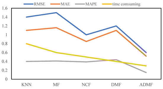 Several traditional methods of predicting student performance were compared, including the KNN, MF, NCF, and DMF. They were tested on dataset 1, and the final experimental results are shown in Figure 4. We found that the NCF, DMF, and ADMF accomplish higher prediction results than the MF and KNN. The ADMF is the best predictor for students in the next semester. Because the MF is extended to multi-layer neural networks, the ADMF encompasses a stronger ability to spot the input file, which will learn complicated nonlinear structural options hidden in the information, and might conjointly mix easy options into much more complicated options, with flexibility and accuracy. This method decomposes the student course score matrix into row vectors and column vectors, which represent the student scores of each course and all student scores of a specific course, respectively. Then, the row vectors and column vectors are embedded into a low-dimensional space and input into a multi-layer perceptron network based on a self-attention mechanism to further extract information from potential feature vectors, in which the attention mechanism is added, and it can quickly extract the important potential features of the students and courses. Secondly, a bilinear pooling layer is built in the model to improve the generalization and learning ability of the model.