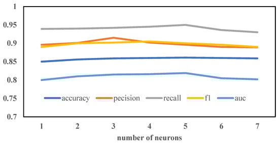 Our model has two deep neural networks. When the network contains multiple hidden layers, if the number of neurons in the hidden layers is different, many experiments are required. The number of neurons in the layer is set to the same number. The experimental results are shown in Figure 5. This paper carried out six experiments, changing the number of neurons in turn. From the experimental results, when the number of neurons is 256, the recall rate is about 95%, the precision is about 90.7%, the AUC is about 82%, the accuracy rate is about 86.6%, and its model performance is the best. This is mainly because as the number of neurons increases, the model can learn more feature information, but once the variety of neurons increases to a precise number, the model learns the effective information is not increasing, and it will even introduce noise that reduces the prediction performance of the model. It is seen from this that once it involves deep neural network coaching, the quantity of neurons is not the maximum amount as the potential, neither is it as little as the potential. It is necessary to incessantly compare the model coaching and learn to pick out the optimum range of neurons.