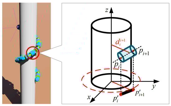 From the analysis of Section 2.2, we find that both and have a determinative effect on the spiral climbing gait, as reflected in that by changing a single parameter, the radius and pitch of the form spiral of the snake-like robot will change. As shown in Figure 4, there exists any one joint module in contact with the surface of the cylindrical object when the snake robot wraps its body around the surface of the cylinder. We describe the two ends of the module are described as and , respectively, using the improved D-H parameter method, at which the distance between the joint module and the centerline of the cylindrical object can be expressed as: