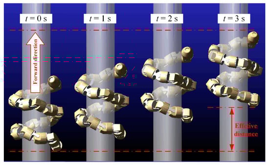 Figure 3 shows that we can obtain the change in the snake-like robot’s spiral climbing gait by adjusting the control parameters , , and , respectively. We can learn that the parameter affects the pitch of the spiral climbing gait, and the more significant is, the more extensive the output range of the joint angle becomes. Accordingly, the complete spatial pattern of the robot shows a more twisted state at this time. Parameter determines the radius of the robot’s spiral, and the radius decreases with increasing . In this case, the variation of the adjacent joint angle becomes more prominent, which in turn decreases the pitch of the spiral climbing gait. Thus, the robot shows a compressed state as a result. Parameter has no significant effect on the motion itself, except that it changes the direction of the robot’s spiral at the global level. Thereby the effect of is not considered in the subsequent studies.