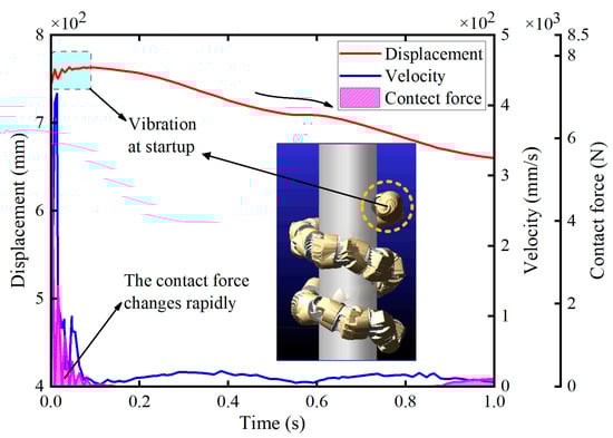 The simulation indicates that in the moment of motion initiation, as the snake-like robot changes from the zero-moment state to the state of spiral climbing motion, the robot needs to break the original equilibrium state to another. Thereby, a shaking exists. Taking the head joint as an example, as shown in Figure 14, because of the contact between the head joint and the cylinder surface at the moment of the startup, the instantaneous contact force appears to change drastically, resulting in a vibration trend in the displacement of the head module. Furthermore, as the snake robot’s posture gradually gets balanced, the joint module’s displacement and contact force begin to change smoothly. Therefore, the first 0.5 s of the startup moment were ignored in the subsequent analysis to obtain a better analysis of the spiral climbing motion.