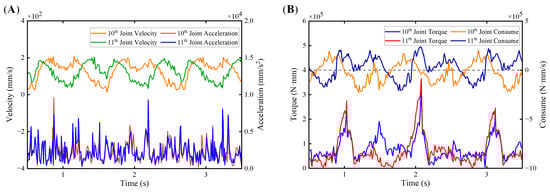 The mechanic characteristics of adjacent modules: (A) velocity and acceleration relative to time; and (B) joint torque and consumption relative to time.