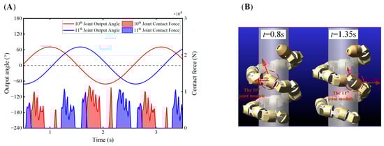 Figure 17 shows the pattern of output rotation angle and contact force variation of four successive adjacent central joints. In addition to the similar periodic regularity of contact force variation with two adjacent joints, not all the joints are in contact with the cylinder surface simultaneously. As illustrated in Figure 17B, only the 9th and 11th joints among the inspected joints are in contact with the cylinder surface when . While , only the 10th and 12th joints are in contact with the surface of the cylinder. Figure 17A clearly shows the delay effect between the contact cycles of the different joints. Different joints’ contact forces will effectively cover the time axis to provide enough contact force for the snake-like robot to climb upwards stably within the same time frame.