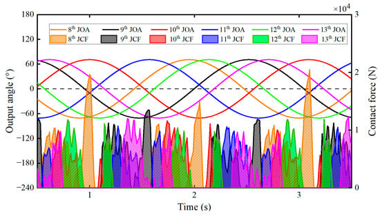 The output angle and contact force of two adjacent joints: (A) the output angle and contact force of joint modules; and (B) the contact force is applied to modules at different time points.