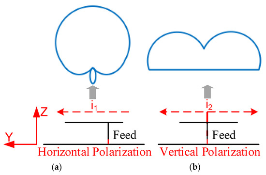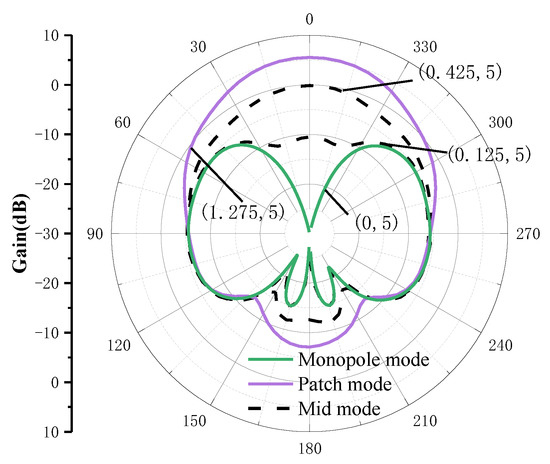 Figure 2 shows two different operating modes of the proposed patch–monopole antenna. For patch mode (Figure 2a), the current flows from one edge of the patch to the other edge. Note that the position of the feeding probe can also change the specific horizontal polarization of the patch mode (for example, the specific polarization could be along the x-direction, y-direction, or other directions). For the monopole mode (Figure 2b), the current starts from the end of feeding probe (near the ground), flowing upwards, and then going to the edges of the patch. In principle, these two modes co-exist (more or less) for every feeding position. However, their strength and phase relationships are quite different (for different positions). For better demonstration, as shown in Figure 1b, the center of the dielectric substrate is defined as the coordinate origin (O). Therefore, the location (taking right element as reference) of the feed port can be represented by coordinate points ( X i , Y i ). The solid line in Figure 3 shows two special cases (unit: mm) when the patch mode and monopole mode are dominated, respectively. The middle pattern between two specific radiation modes is shown by the dotted line in Figure 3. At location (1.275, 5), the feeding probe is in the middle line of the patch (similar to the feeding approach of a traditional patch). The patch mode is then dominated, which resulted in broadside radiation. However, at location (0, 5), the feeding probe is at the center of the patch. Since the center position is a virtual-ground (0 voltage) condition for patch mode, this position can only excite monopole mode, which resulted in end-fire radiation. It is worth mentioning that, by adjusting the position of the feed point X i from 0 to 0.125, it can be observed that the radiation mode is similar to the monopole mode, but there is already a trend of broadside radiation. Continuing to adjust X i from 0.125 to 0.425, broadside radiation is further increased. The simulated results illustrate the existence of two radiation modes of the proposed patch–monopole antenna, and some intermediate modes can be obtained by adjusting the feed point position X i .
