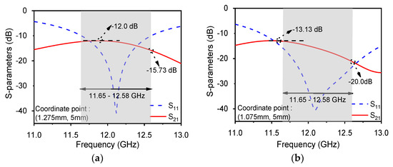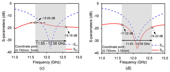 Figure 4. Simulated S−parameters of path−monopole antenna array with different coordinate points of feed probe. (a) (1.275 mm, 5 mm); (b) (1.075 mm, 5 mm); (c) (0.795 mm, 5 mm); and (d) (0.795 mm, 3.55 mm).