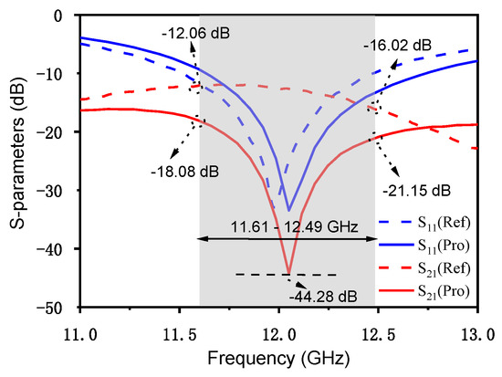 To further verify the decoupling mechanism of the proposed technique, the patch–monopole antenna arrays with different feeding points are simulated by using an EM simulator. The antennas are fed by 50 Ω coaxial lines from the back of the ground. The center-to-center distance between two patches is 0.404 λ 0 , where λ 0 is the wavelength in free space. Figure 4 shows the simulated scattering parameters of the patch–monopole antenna with different feeding positions. It is obvious that, in the frequency band (11.65–12.58 GHz) with return loss under −10 dB, the mutual coupling is reduced step by step with the altering of coordinate positions. Moreover, the port isolation is enhanced by about 3.5 dB~24.09 dB in the operating band.