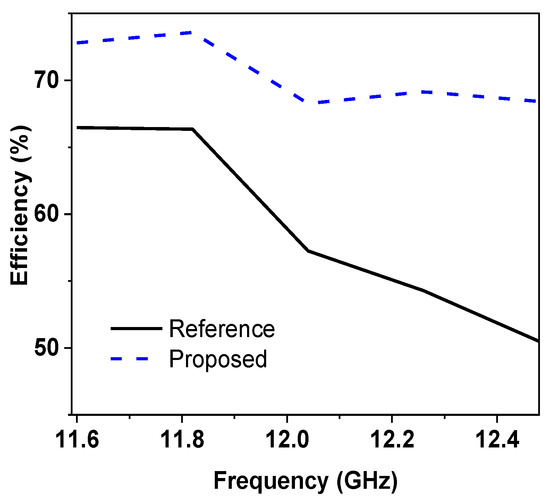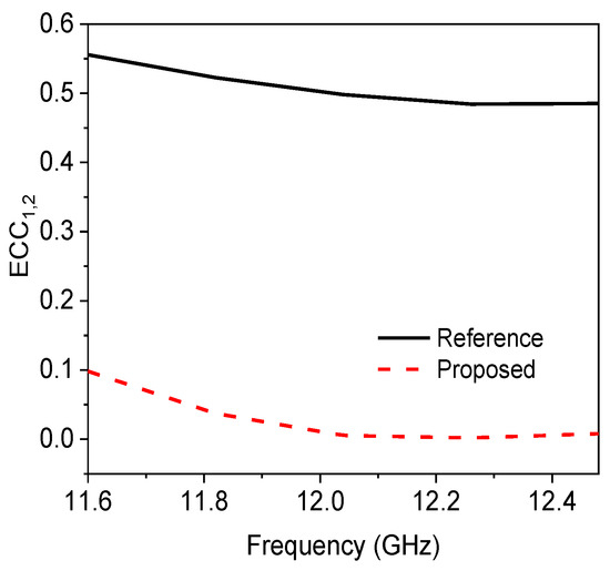 The proposed antenna array with center-to-center spacing of 0.404 λ 0 is designed, fabricated, and measured. A reference array based on traditional patch antennas is also designed and characterized for comparison. Rogers RO4003 is selected to fabricate the dielectric substrate, whose dielectric constant is 3.55, loss tangent is 0.0027, and thickness is 1.542 mm. The photographs of fabricated MIMO antennas are depicted in Figure 6, and the dimensions of antennas are shown in Table 1. The S-parameters of MIMO antennas are recorded by the Vector Network Analyzer (VNA), with frequency ranging from 11 to 13 GHz. Figure 7 shows the measured S-parameters of both arrays. It can be seen that the frequency band with reflection coefficient under −10 dB is from 11.61 to 12.49 GHz, and the port-isolation of the proposed antenna is improved by about 6~32 dB in comparison to the reference one. It is observed that the proposed MIMO antenna has a smaller frequency deviation than the reference one. The difference is mainly due to the manufacturing errors of substrate, welding, and test environment. The total efficiency and radiation patterns are measured by a microwave chamber (Figure 6e). When one antenna port is excited for measurement, another port is terminated by a 50 Ω load. Figure 8 shows the measured efficiency of two antenna arrays. Obviously, in the operating band, more than 10% of the total efficiency is increased after using the proposed decoupling method. Figure 9 gives the measured ECC values (far-field) of both arrays. The proposed patch–monopole array has much lower ECC (<0.1) than the traditional patch array (>0.5). Figure 10 shows the radiation patterns of the arrays. In summary, the performance of the proposed array is much better than the reference array.