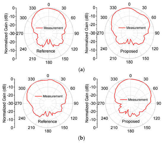 Figure 10. Measured radiation patterns at center frequency. (a) xoz−plane. (b) yoz−plane.