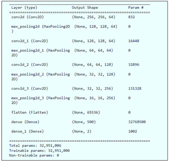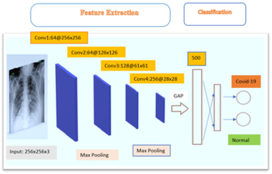 This information is used in the proposed plan to build a lightweight CNN architecture with four layers for classifying chest X-rays. Layers of batch normalization and max-pooling are added to the convolution layers. For classification tasks, the linked layer is usually the last layer of the CNN architecture. This layer gives the expected probabilities for each class label [34]. The space layer is the most important part of making class-specific activation maps. Due to this, it enforces a solid correlation between attribute maps and classes. That reduces the chance of overfitting. So, according to Anderson [54], global average pooling (GAP) is the last layer in the proposed CNN design instead of being a connected layer. The average feature map of the last convolution layer is used to put chest X-ray pictures into groups. The last layer of the proposed system is meant to keep data from being lost. This will make sure that important details (information) are not lost during the space mission. The final layer that is recommended uses 256 filters and has a size of 28 × 28. Figure 4 and Figure 5 illustrate the suggested model’s description.