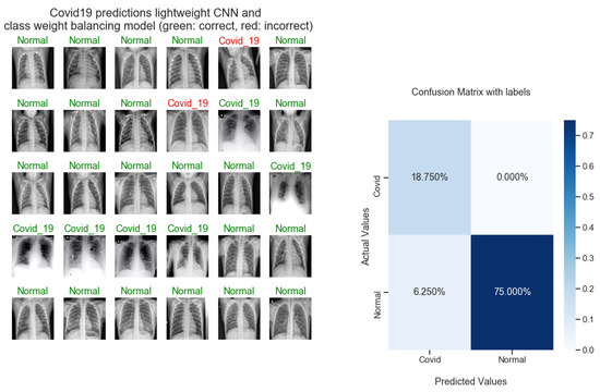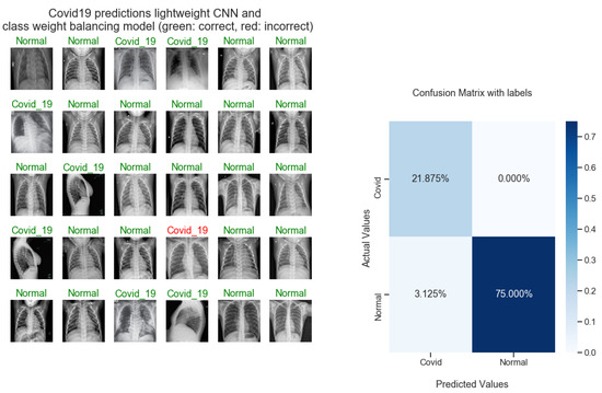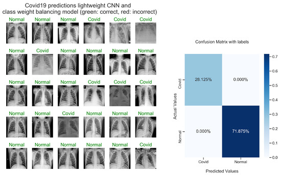 In Figure 1 and Figure 2, you can see how the images in each data set are spread out. For each training session, a batch size of 32 is used to train the model. The model is trained on the categorical cross-entropy (CCE) and the binary cross-entropy (BCE) loss functions, see Equations (3) and (4). Additionally, for back-propagation, the optimizers Adam with a learning rate of 0.01 and SGD (learning rate = 0.01; momentum = 0.9) are utilized. All results are displayed in Table 1, Table 2, Table 3 and Table 4. During the training phase, training and validation examples are applied with the class weights. The learning is penalized in accordance with the class-specific weights. Where the weight value of the COVID-19 class (576 samples) is 1.874, the weight value of the normal class (1583 samples) is 0.682 for the data set 2, and where the weight value of the COVID-19 class (102 samples) is 2.529, and the weight value of the normal class (4 hundred and fourteen samples) is 0.623 for the data set 1.