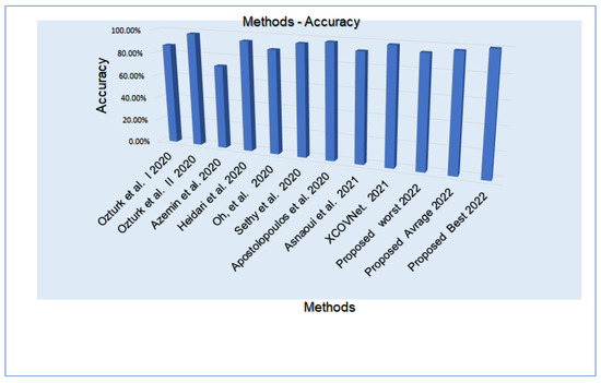 Sethy et al. [37] came up with a way to use X-ray images and deep learning to find a COVID-19 infection with 95.38% accuracy. In the same way, Apostolopoulos and Mpesiana [34] suggested for COVID-19 an X-ray image deep learning model that was 98% accurate. Ozturk et al. [35] implemented two deep learning-based methods for binary categories (COVID-19 and non-COVID-19) and three-way categories (COVID-19, normal, and pneumonia), reaching 98.08% and 87.02% accuracy, respectively. Oh et al. [57] used a logical approach to figure out how likely it was that X-ray COVID-19 pens would break. They cooperated on a regional patch-based technique utilizing chest morphology, mean chest, intensity, and standard deviation of chest endurance in five classes: normal lungs, tuberculosis, pneumonia, viral pneumonia, tuberculosis, and COVID-19. Their design achieved the highest classification accuracy of up to 88.9%. Azemin et al. [58] came up with a deep learning-based forecasting method that could tell the difference between COVID-19 and normal chest X-rays with an accuracy of 71.9%.
