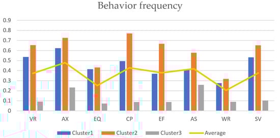 The study showed that the SRL behavior displayed by students in Andes can be grouped into three groups through clustering analysis. Specifically, Figure 2 proves that there are significant differences in SRL behavior among different learning groups in the online environment. Cluster 1 with average behavior frequency showed a more proactive attitude toward online learning. They think about learning tasks, formulate learning objectives, and carry out deep learning effectively driven by strong motivation. Cluster 2 with the highest frequency of behavior tends to rely on online environmental feedback, and they complete online learning better with the help of system data and tips. Cluster 3 has the lowest frequency of behavior, showing passive completion of learning tasks.