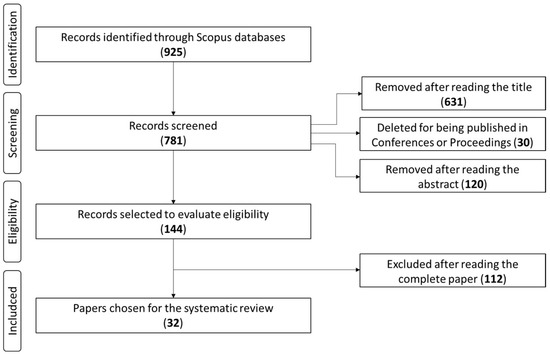 Because of the bibliographic search in the Scopus database and the PRISMA methodology, 925 articles were identified. Then, the first screening by title indicated that 631 articles did not meet the selection criteria for this review, resulting in 265 articles. Then, we applied the following screening for work published in conferences or proceedings, which allowed the elimination of 30 articles. Afterward, screening by abstract revealed that 120 studies did not meet the review’s objectives. Thus, the final screening by the full-text reading of the remaining papers revealed that 112 articles were related and did not apply to machine learning techniques concerning the keywords under study. Therefore, the final list excluded these articles. Finally, this work includes 32 articles regarding the application of ML algorithms to predict mortality risk in COVID-19 patients and comorbidities.