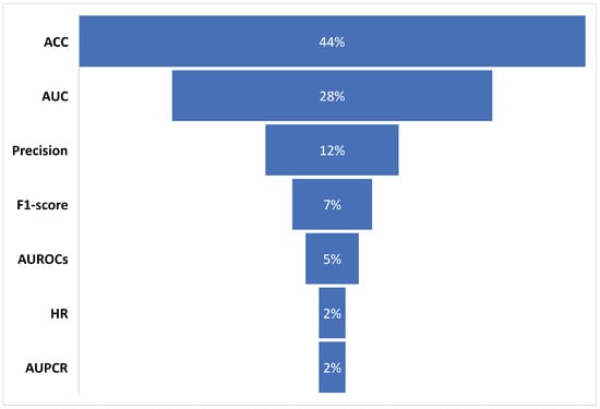 This review considered all reported algorithms from reviewed studies. Concerning the performance of the prediction models, the essential process is the evaluation of the ML algorithms used in the model, which is based on a series of performance metrics. The most used metrics for the 32 included studies were HR, ACC, AUC, F1-score, precision, AUPCR, and AUROCs. As a result, Table 5 shows that the most used metrics by the 32 studies to evaluate the performance of the algorithms used in the prediction models were ACC and AUC, with 19 and 12 times, respectively. Finally, Figure 2 shows the percentages of use of the metrics in the articles reviewed in this work.
