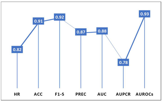 Additionally, it is known a priori that “the higher the accuracy of an algorithm, the greater the possibility of making an accurate prediction.” Figure 3 presents the overall average performances of the metrics used in the studies analyzed, where the metrics with the best prediction rate were AUROCs (93%), followed by F1-S (92%) and ACC (91%). The rest of the metrics had a 78% and 87% prediction rate.