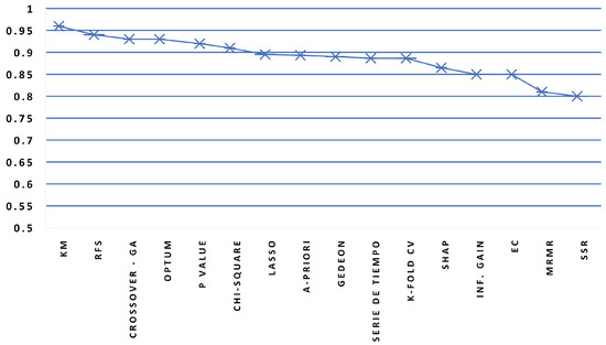 Figure 4 shows the average performance values of the algorithms as a function of the feature selection technique, such as time series, SSR, and MRMR. At the same time, we identified that KM and SHAP have the best performance.