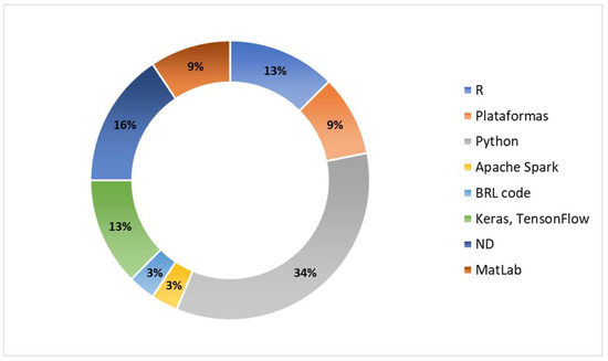 The study demonstrated that 13% (4/32) of the R language includes linear and non-linear models, easy-to-create graphics, multiplatform, and open-source material. However, it can be challenging to learn and slow to function with regards to many programming languages. Keras-TensorFlow appears with 13% (4/32) of participation in the reviewed works, which has, as a differentiating character, the use of neural network algorithms and its compatibility with Python. However, it adds a layer of complexity to the processing because it uses dependencies. Regarding MatLab, only 9% (3/32) of studies used it, although it offers high precision in its calculations, comprehensive support, fast prototyping, and an extensive community. However, it is necessary to pay a license fee for its use. For more details, see Table 9.