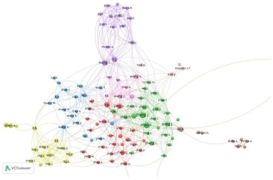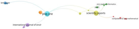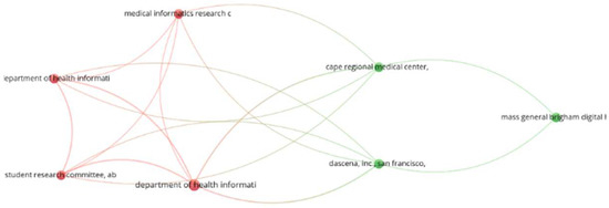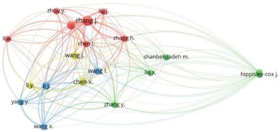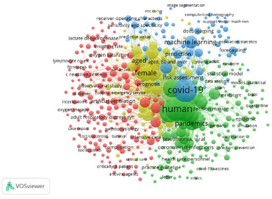Figure 7 shows the bibliographic coupling between authors with at least one citation and four published papers (resulting in 22 authors with this coincidence), where the clusters, in red, blue, and green represent the authors who had developed similar works related to the prediction of mortality risk in COVID-19 patients and patients with comorbidity, based on ML algorithms, and who cite the same source in their reference lists. The similarity in the color of the authors’ clusters also implies a more significant overlap between the reference lists of these authors’ publications. Additionally, shows visible names which may not be included in the map structure.