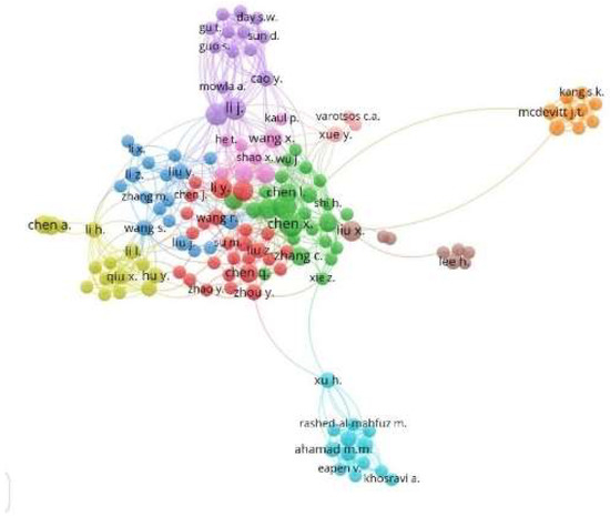 Bibliographic coupling between authors. Three clusters, red (top), blue (bottom), and green (right), correspond to all authors working in similar research fields. ML was applied to COVID-19, and the same sources in their reference lists were cited.