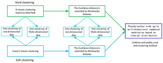 Therefore, an anti-clustering method of pseudo-center wide-agile multi-dimensional compound modulation based on interval distribution is proposed in this section for the hard clustering and fuzzy soft clustering methods. A schematic diagram of the analysis and derivation logic is shown in Figure 3.