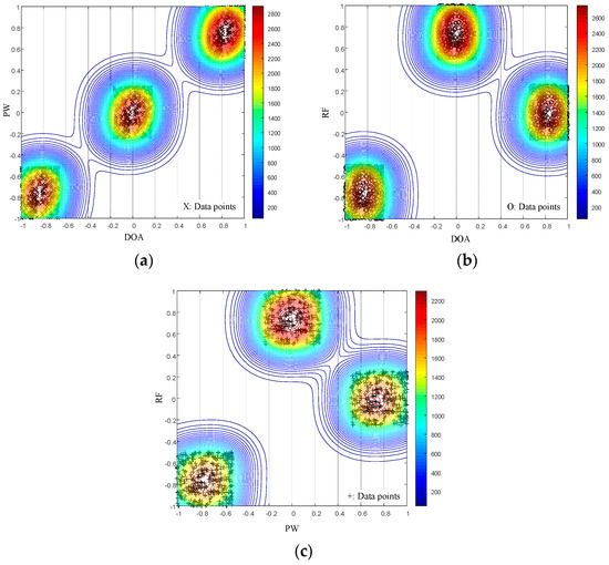 Two-dimensional distribution of the random interference pulse anti-sorting signal parameter equipotential lines. (a) Two-dimensional diagram of the PW-DOA equipotential line. (b) Two-dimensional diagram of the RF-DOA equipotential line. (c) Two-dimensional diagram of the RF-PW equipotential line.
