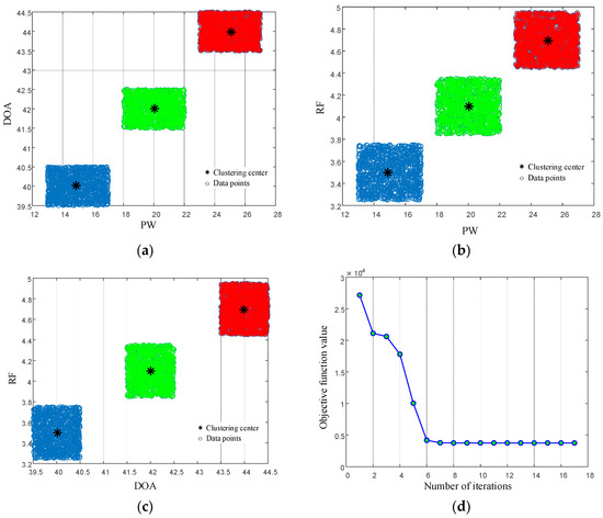 FCM clustering diagrams of signal parameters designed without three-dimensional pseudo-center wide-agile composite modulation. (a) PW-DOA two-dimensional cluster diagram. (b) PW-RF two-dimensional cluster diagram. (c) DOA-RF two-dimensional cluster diagram. (d) The change of the objective function.