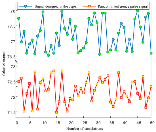 The parameter settings of the designed signal and random interference pulse signal are shown in Table 2 and Table 3. Each of these signals contains 10,000 pulses. In order to ensure that the margin value can more accurately reflect the anti-sorting performance of the signal, the Monte Carlo simulation is carried out 1000 times, and 50 of these are randomly selected for drawing, as shown in Figure 9.