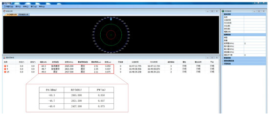 Figure 14 shows the signal sorting results generated by the signal sorting experimental system using the anti-sorting signal design method proposed in this paper. It can be seen from Figure 14 that there are three rows of parameters in the interface of the sorting experimental system, indicating that the sorting experimental system has sorted out three radar signals. The first signal amplitude is −60.3 dBm, the carrier frequency is 2065 MHZ, and the pulse width is 0.05 us. The second signal amplitude is −48.7 dBm, the carrier frequency is 2821.5 MHz, and the pulse width is 0.037 us. The third signal amplitude is −49.0 dBm, the carrier frequency is 2437.5 MHz, and the pulse width is 0.075 us. The sorting test system incorrectly sorts the signals originally sent by one radar into three radar signals. That is, one radar is incorrectly sorted into three radars. The clustering algorithm is working incorrectly. The sorting results in Figure 14 directly illustrate that the anti-clustering signal design method proposed in this paper can be used to design signals with anti-clustering and sorting ability of RF stealth.