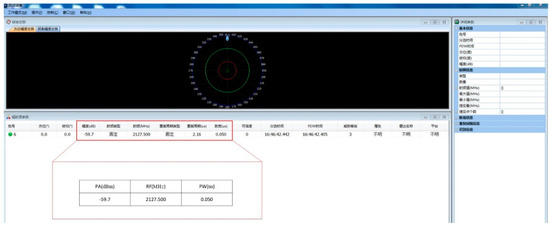 Figure 15 shows the sorting results generated by the signal sorting experimental system without applying the anti-sorting signal design method proposed in this paper. As can be seen from Figure 15, there is a row of parameters in the interface of the sorting experimental system, indicating that the sorting experimental system has sorted out a radar signal. The amplitude of the signal is −59.7 dBm, the carrier frequency is 2127.5 MHz, and the pulse width is 0.05 us. The sorting system can correctly sort out the signals that are not designed using the design method proposed in this paper. It can be seen from the comparison of Figure 14 and Figure 15 that the signal design principle proposed in this paper can design signals with anti-cluster-sorting ability. For such signals, even the efficient sorting test system cannot achieve effective sorting identification.