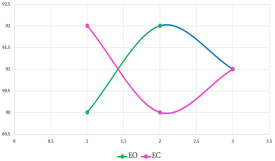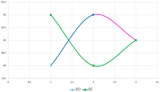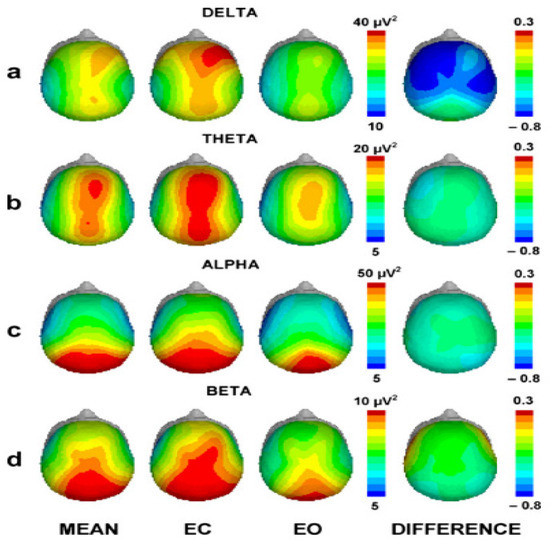 Moreover, twenty-eight university students’ EEG data were gathered while they were resting with their eyes closed and their eyes open; then, Fourier transform was applied in the theta, delta, beta, and alpha bands and analyzed in nine regions across the scalp to make estimations of total power [40]. Arousal level was also determined by measuring skin conductance. Topographic effects of the situation are shown in Figure 1.