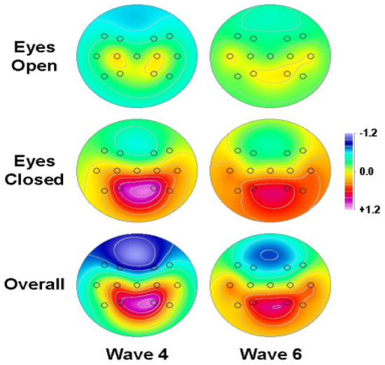 Resting EEG data from 70 subjects were analyzed by the authors of [41] (46 adults, 29 male), across testing sessions spaced by 12 ± 1.1 years. Alpha of EEG was separated, quantified, and identified by applying reference-free techniques that combine principal component analysis (PCA) with current source density (CSD). Measures of overall (EC-plus-EO) and net (EC-minus-EO) posterior amplitude of alpha and inconsistencies in asymmetry were compared among several trials. Waves 4 and 6 of the resting EEG’s CSD-fPCA structure are shown in Figure 2 and Figure 3 at 13 electrode sites common to both waves and topographies of the mean alpha of factor scores, respectively.