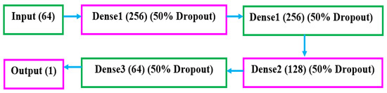 F-FANN is implemented to predict the state of the eye, depending on the input values collected from the EEG signals. As each instance consists of a one-dimensional vector, with 64 values, the implemented neural network uses only fully connected layers. According to the number of attributes in the data, the number of neurons in the input layer is set to 64 neurons: 1 neuron per each input value. This input layer is linked to the first hidden layer, which consists of 256 neurons. In addition to this hidden layer, 3 more hidden layers are used before the output layer, with 256, 128 and 64 neurons, sequentially, producing a total of 4 hidden layers. The output layer consists of a single neuron, as a single output is required from the neural network to describe the probability of the input to be collected from a subject with EC state. A summary of the implemented feedforward artificial neural network is shown in Figure 5.