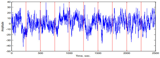Each channel’s EEG signal is first adjusted to one variance and zero mean. Additionally, it is segmented into adjacent frames (each one lasts for one second, which is equivalent to the length of one hundred and fifty samples). The result is 10 frames transmitted on each channel. Figure 6 shows an illustration of this procedure.