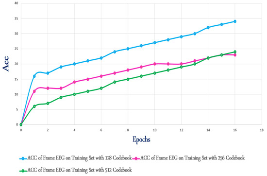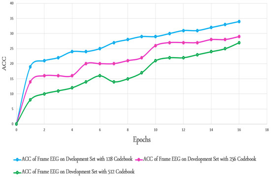 The number of times each codeword appears in an audio EEG clip was used to create the BoW vector representation of that clip. The pseudo codeword labels produced by the systems of baseline k-means were used to build DLVQ systems. The input of all DNNs is a splice of the center frame and its 8 context frames, and each layer of the 7 hidden layers has 2048 nodes as in [42]. Each system’s output softmax layer shares the same dimensionality as the codebook vocabulary of its respective VQ initializer system, that is, 128, 256, and 512, respectively. Based on the Kaldi voice recognition tools, we developed the DNN systems. The DNN is trained using the following method: layer-by-layer generative pretraining is used for parameter initialization. As a next step, we use backpropagation and the cross-entropy goal function to train the network discriminatively. The initial learning rate is set at 0.09, and the minibatch size is set to 256. Then, frame accuracy is checked on the development set after every training iteration, the learning rate is reduced by a factor of 0.5% if the improvements are less than 0.5%. After the accuracy of frame enhancement drops to less than 0.1%, the training procedure is terminated. The 128-codeword k-means-based DNN trained in practice obtained 34% frame accuracy on the training and test datasets, respectively; the 256-codeword k-means model obtained 23% and 29%, respectively; the model dependent on 512-codeword k-means obtained 24% and 27%. Figure 5 shows these findings, which show that the frame EEG accuracy-shifting tendencies in the training and development set are similar and primarily growing. This demonstrates that the DNN can successfully imitate its VQ initializer through cross-entropy training (the “labels” by k-means VQ being retained); however, because the accuracy of the last frame was below 50%, we may infer that the DNN is not figuring out the specifics of its initializer’s operation, but rather is actively gathering fresh data. The representation of BoW of an audio EEG clip was then made by running the clip’s frames through a trained DNN and adding up the resulting vectors. For both the baseline and suggested frameworks, as a histogram, the properties of the BoW vector representation for each clip were normalized so that they added up to 1. HIK kernel and SVMs were applied as the classifiers. It is evident that in MAP, DLVQ achieves a 4.5% relative increase over the k-means baseline. An approximate 10.5% relative gain was obtained when fusing the findings of the baseline and proposed systems. DLVQ picks up some supplementary data that k-means miss. According to their AP scores on the development set, the two systems’ classifier scores from the basic late fusion approach are simply weighted together. These encouraging results demonstrate that DLVQ does aid in improving the representative power of VQ-based BoW vectors. Figure 7 offers the accuracy of DLVQ with different codebooks in training sets. Figure 8 offers the accuracy of DLVQ with different codebooks in development sets.