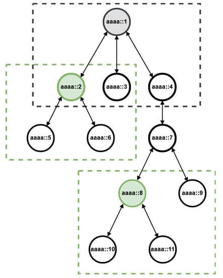 As said, IoT networks have relevant characteristics that must be taken into account when designing or using a protocol for a specific purpose. Fortunately, nowadays, there is a protocol standard that can help to cope with the main problems of a 6LoWPAN network: the RPL routing protocol. In addition, since some decades ago, IP global addressing has been a concern because of IPv4 address exhaustion [], and with the increasing number of devices connected to the Internet, there is a need for the transition to IPv6 in order to have a sufficient number of addresses that can be used to respond to the growing demand each year. IoT devices are not exempt from this problem. Hence, the standard protocols to be used by IoT devices would typically rely on IPv6.