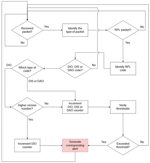 Signature-based detection: Version number attack is a substantially different attack than those described above. Therefore, it requires a different strategy in order to be detected. Briefly explained, an attacker launching the version number attack issues a higher DODAG version number to the rest of the nodes in order to cause disruption in the network. If the IDS is capable of identifying this malformed packet, the attack will be detected as soon as the packet is inspected. In this scenario, a signature-based detection method is required in order to detect the attack. Thus, by taking into account that only the root node issues a higher version of the DODAG version number, if the central IDS (which acts as the root node) receives a DIO message (control message containing the DODAG information) with a version number that is higher than the current one, the IDS will know that an attack is taking place and will raise the corresponding alert. Algorithm 2 represents the detection algorithm for the version number attack.
