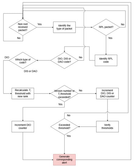 IDS detectors are in charge of the detection of possible intrusions in a specific region of the network, after which they alert the central IDS. This type of node combines the concepts of signature-based, specification-based, and anomaly-based detection methods, as explained below. Figure 3 illustrates the detection method used by the IDS detector.