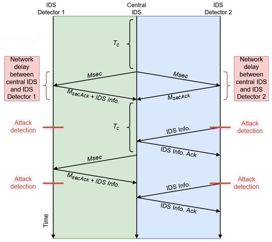Every (where represents an interval of time in seconds), the central IDS sends a message to all IDS detectors in the network. These messages are sent to ensure that the communication between the two parties is working correctly. Hence, if the central IDS does not receive a reply, the link between this specific IDS detector and the central IDS will be marked as down, and further actions from the network administrators will be required. At this point, the design will have two variants, which were evaluated in Section 5. One of the variants is that, in addition to the security message, the IDS detector will make use of the packet sent to raise an alert, if required, so that the central IDS can be made aware of possible attacks outside its range. The other variant consists of sending an alert as soon as the IDS detector is aware of it. The first variant reduces the messages exchanged inside the network, but the IDS will detect attacks every seconds (e.g., 30 or 60 s). On the other hand, if the IDS detector needs to send the alert as soon as the attack is detected, resource usage is increased as well as the number of exchanged messages when an attack takes place. Figure 4 illustrates the communication protocol for the aforementioned variants. IDS Detector 1 uses the variant of sending only relevant information every time the central IDS asks for this information. On the contrary, IDS Detector 2 sends the attack information as soon as it detects the suspicious behaviour.