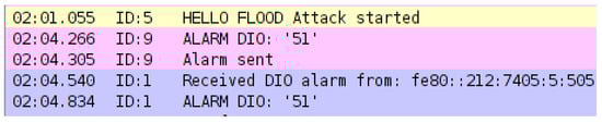 Another work around the topic of IDSs for IoT was performed by Ioulianou et al. []. The authors presented a signature-based IDS design and analysed two DoS attacks (Hello flood attack and version number attack) by using ContikiOS and the Cooja simulator. Additionally, in order to exclude the attacker from the network, the authors proposed an IDS module installed in the border router that would create a new rule in the firewall to remove the attacker from the network if the IDS detected that it was acting as a malicious node. Ioulianou et al. concluded their work by showing the high impact caused by the Hello flood attack and the version number attack. A future work is expected to implement the IDS and to test it against DoS attacks in the Cooja simulator to analyse the performance of this IDS design.