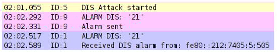 Hello flood attack: This refers to the launch of a flooding attack on the victim by using Hello messages (i.e., the initial message sent from a node to the neighbours in order to join a network). Two variants of the Hello flood attack can be distinguished. Some authors consider that the initial message in RPL is the DIS control message because it is the first message to be sent from a node that wants to join the network []. On the other hand, there are others that consider the Hello message to be the message that a node sends to another to finally join the network (i.e., a DIO message) []. In this paper, the Hello flood attack is considered as a DIO message flood sent by the attacker to the victim, and the Hello flood attack based on DIS messages is called a DIS attack (see below). By constantly sending DIO messages to the victims, the attacker creates a huge activity in the network and causes the victims to process the DIO message, thus consuming even more CPU time. The network congestion and the increased CPU consumption reduce battery life significantly. This attack can be considered as a DoS attack as the main focus is to drain the battery of the nodes in the network so that they become unavailable.